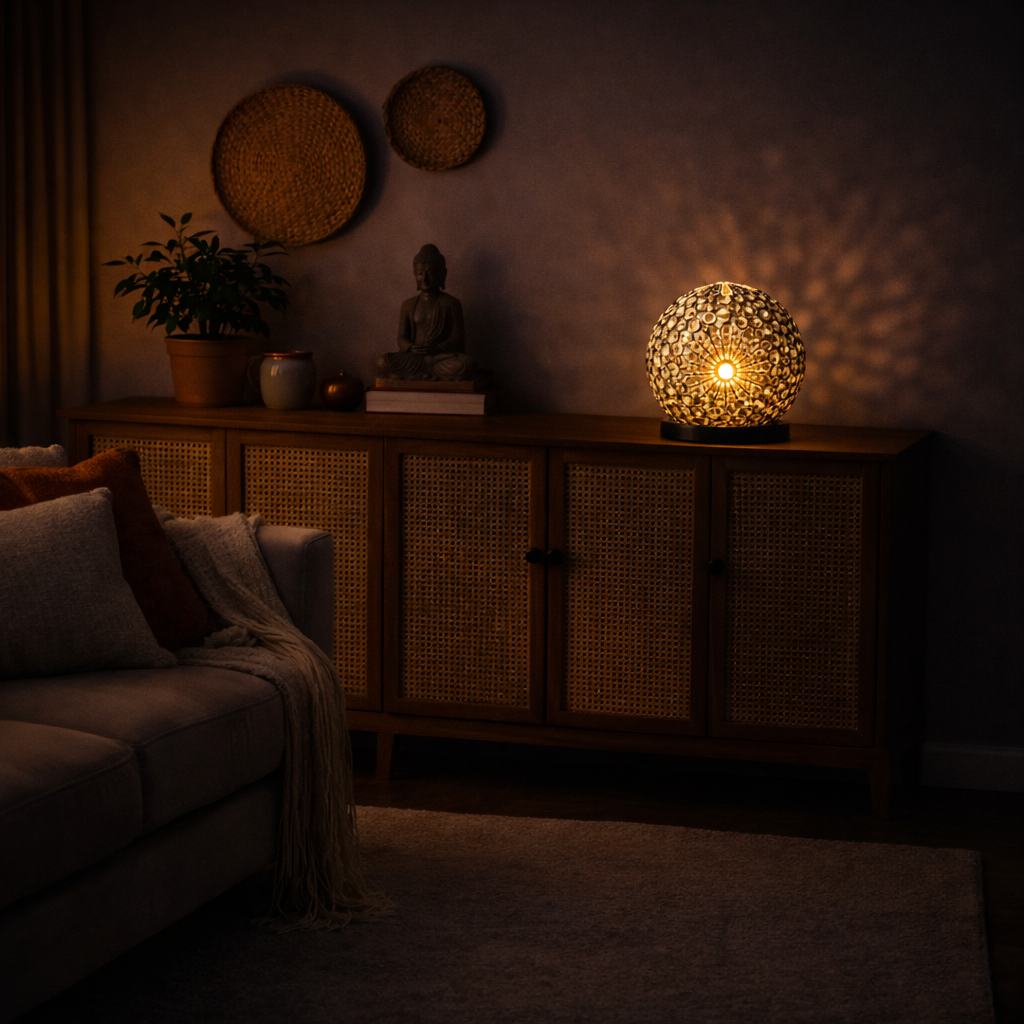 Jede Lampe wird von erfahrenen Kunsthandwerkern sorgfältig aus echten Muscheln gefertigt, die zu einer unverwechselbaren Kugelform mit einem kunstvollen Schokoladenmuster angeordnet sind. Im beleuchteten Zustand filtern die Muscheln das Licht sanft und erzeugen ein weiches, stimmungsvolles Leuchten, das jedem Wohnraum, Schlafzimmer oder jeder gemütlichen Ecke Charakter und Wärme verleiht.