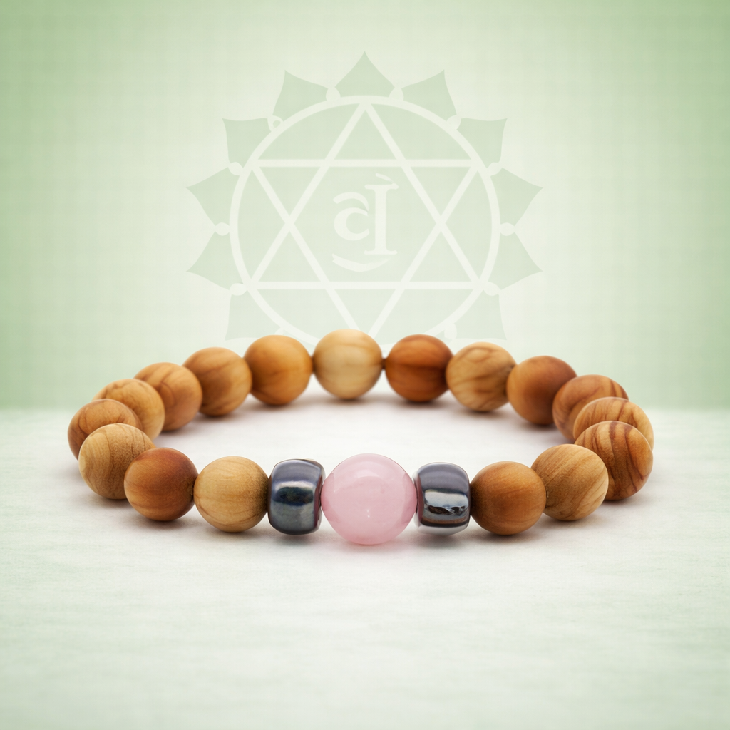 Ein Armband aus Holzperlen mit einem zartrosa Mittelstein, inspiriert vom Herzchakra, das traditionell mit Mitgefühl, Verbundenheit und emotionaler Offenheit in Verbindung gebracht wird. -