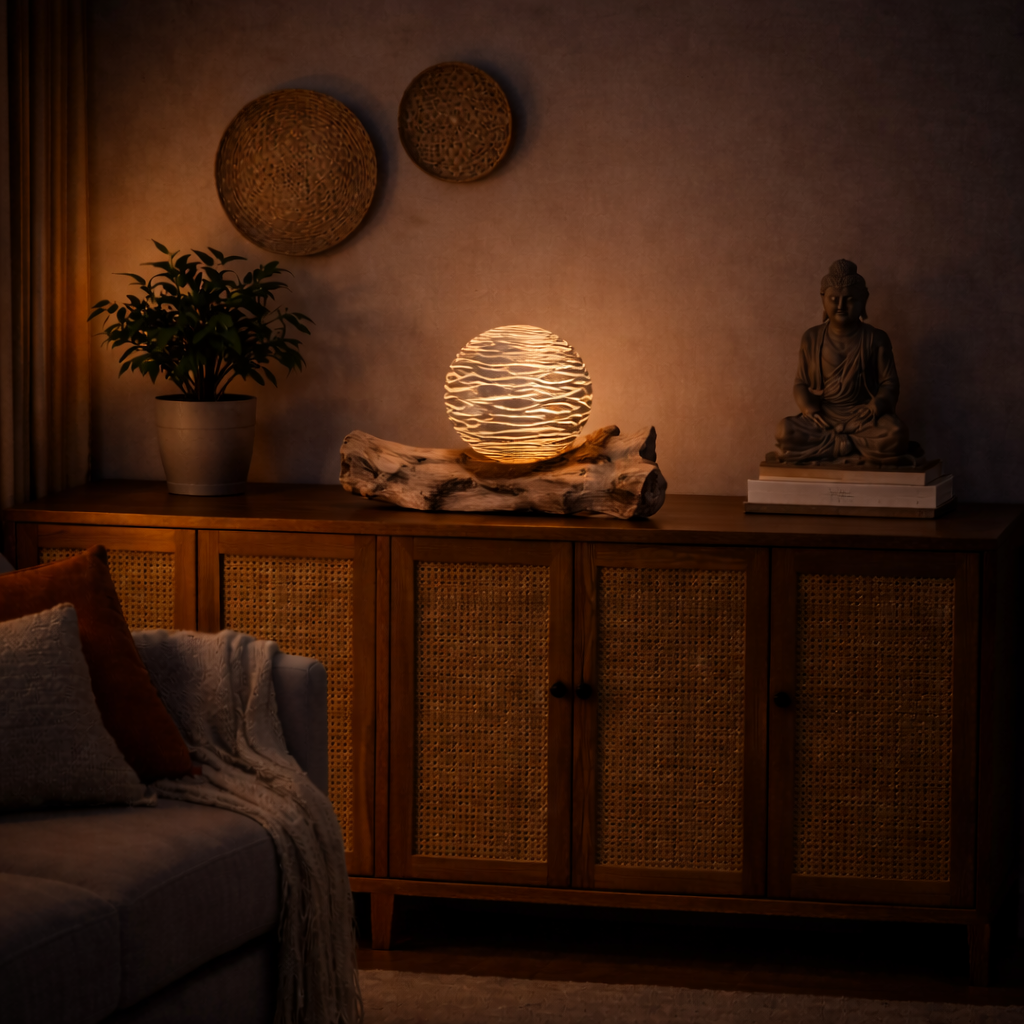 Jede dieser in Indonesien gefertigten Lampen besticht durch einen einzigartigen Treibholzsockel und eine strukturierte Luna-Kugel. Im eingeschalteten Zustand spendet der Schirm ein sanftes, diffuses Licht, das sich ideal für Schlafzimmer, Wohnzimmer oder jede ruhige Ecke eignet, die eine dezente Akzentuierung benötigt.
