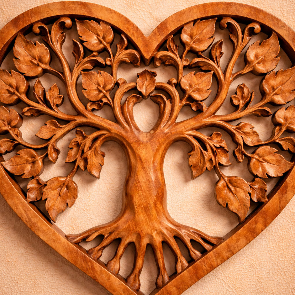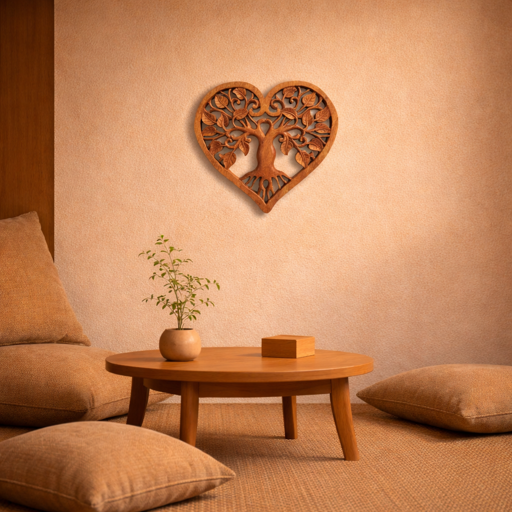 Dieses handgefertigte dekorative Holzpaneel „Herzbaum des Lebens“ (30 cm) ist ein bedeutungsvolles Wandbild, das von erfahrenen indonesischen Kunsthandwerkern sorgfältig aus 100 % nachhaltig gewonnenem Suarholz geschnitzt wurde. Jedes Stück ist ein Unikat und besticht durch seine einzigartige Form, Maserung und natürliche Beschaffenheit.