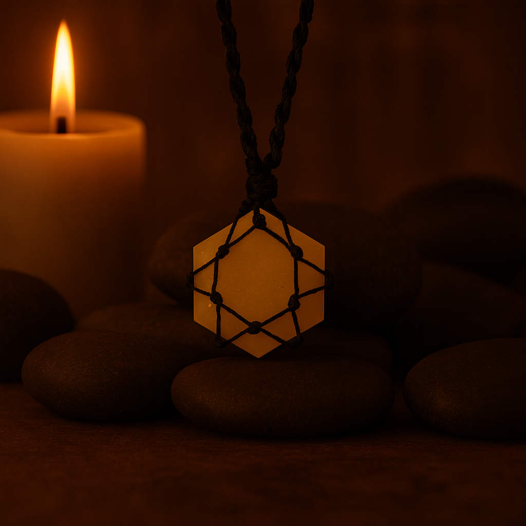 Der Anhänger besticht durch einen sechseckigen, gelben Quarzstein, der von einer feinen Kordel umwunden ist, sodass seine warmen Gelbtöne und die subtilen natürlichen Variationen voll zur Geltung kommen. Die Sechseckform wird oft mit Harmonie und Struktur assoziiert, während die lebendige Farbe dem Anhänger eine frische und belebende Ausstrahlung verleiht.