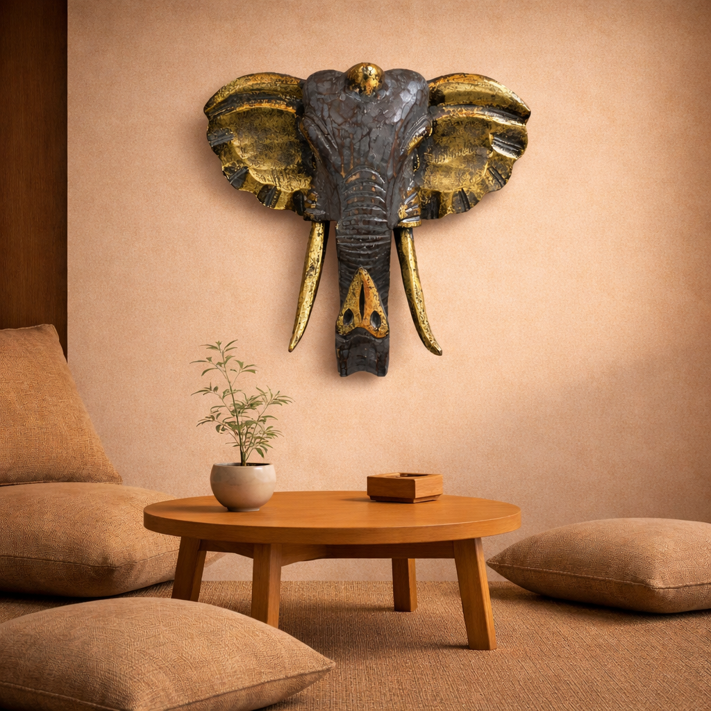 Die leicht abgenutzte Oberfläche hebt die natürliche Maserung und die Schnitzdetails hervor und verleiht dem Elefantenkopf eine kraftvolle und zugleich harmonische Erscheinung. Der Kontrast zwischen Dunkelgrau und Gold erzeugt einen zeitlosen Look, der sich wunderbar in Zen-, Japandi-, Bohème- und moderne Interieurs einfügt.