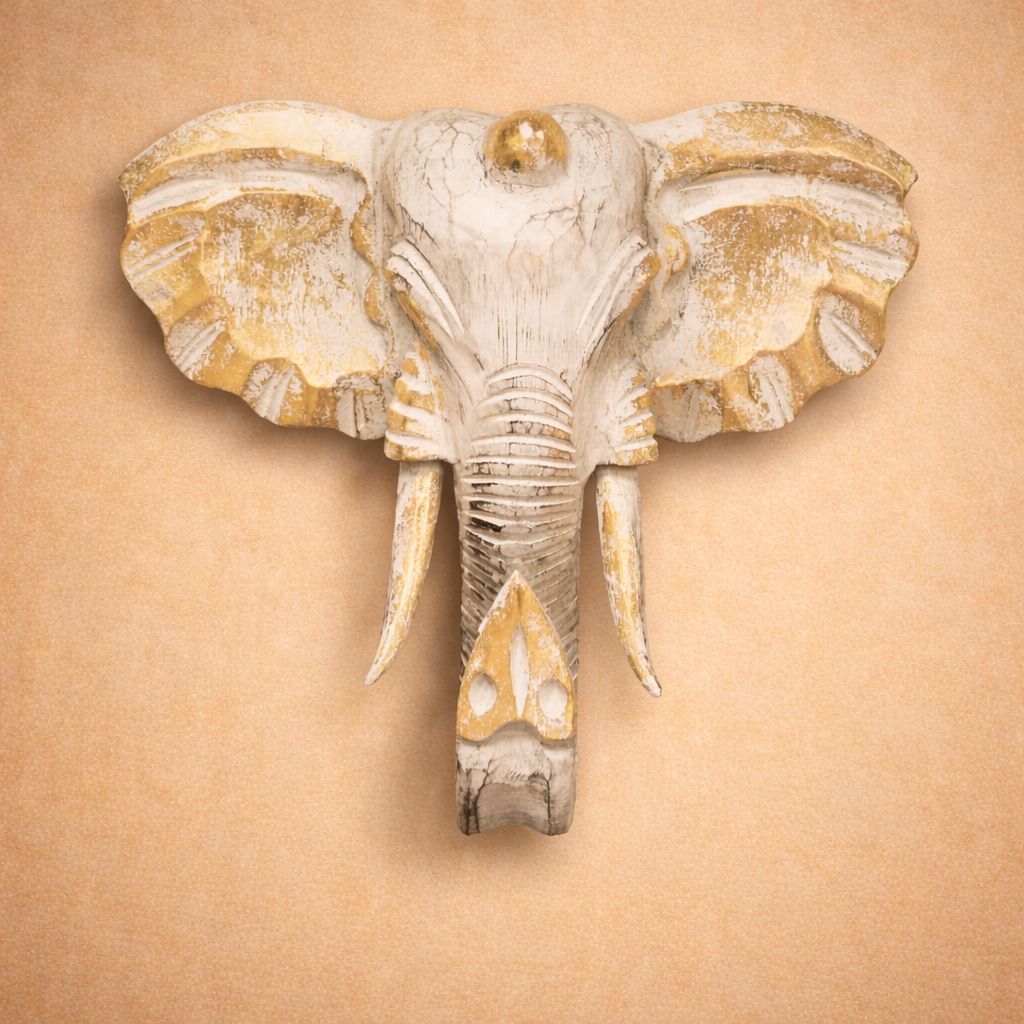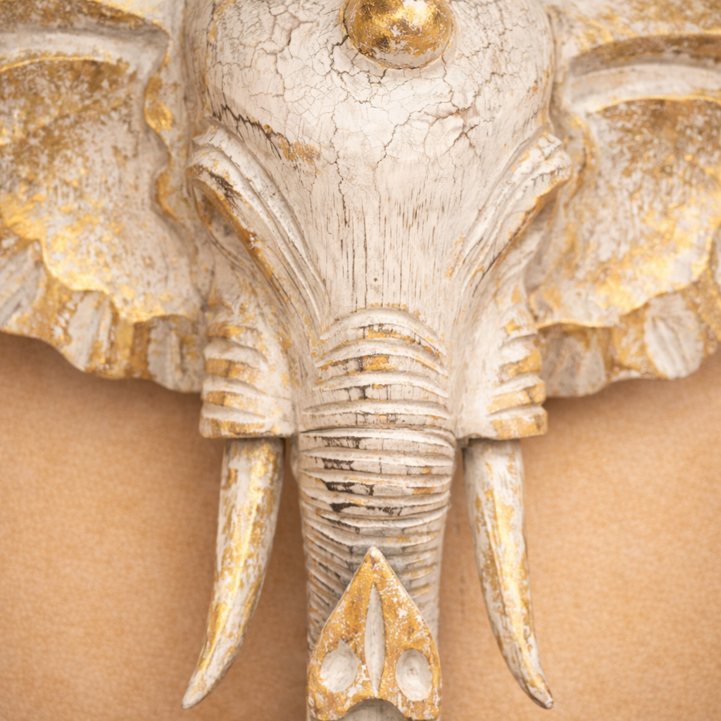 Die sanft gealterte Oberfläche und der dezente Craquelé-Effekt verleihen dem Elefantenkopf ein authentisches, handwerkliches Aussehen und machen jedes Stück zu einem Unikat. Die Kombination aus Weiß und Gold erzeugt eine ruhige und zugleich luxuriöse Optik, die sich mühelos in Zen-, Japandi-, Bohème- oder spirituelle Interieurs einfügt.
