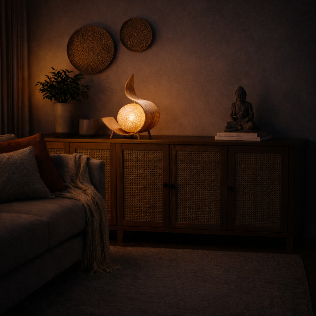 Diese Tischleuchte ist aus echtem Kokosnussblatt gefertigt, einem besonderen Naturmaterial, das sich bei sanfter Erwärmung flexibel formen lässt und so elegante, organische Formen annimmt. Das Ergebnis ist ein leichtes, skulpturales Design, das Ruhe, Natürlichkeit und Zeitlosigkeit ausstrahlt.