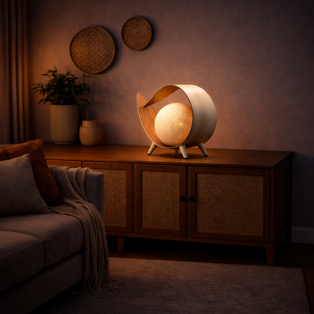 Das Licht wird durch einen Baumwollschirm sanft gestreut und erzeugt so ein warmes, beruhigendes Leuchten. Da jede Lampe aus natürlichen Materialien gefertigt ist, ist jedes Stück ein Unikat . Leichte Formabweichungen unterstreichen ihren natürlichen Charakter und ermöglichen es jedem Kunden, die Lampe auszuwählen, die ihm am besten gefällt.