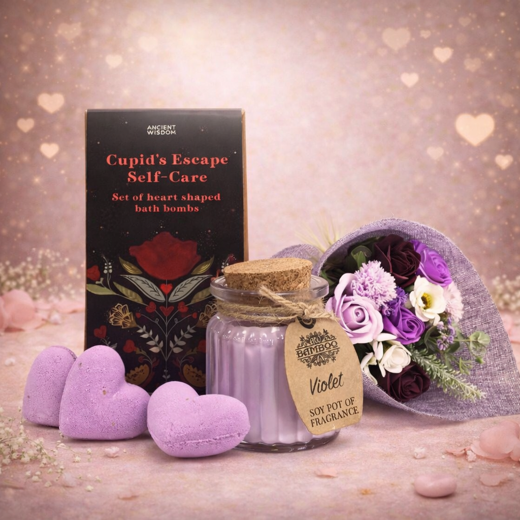 Purple Glow ist ein wohltuendes Valentinstags-Verwöhnset mit herzförmigen Badebomben, einer sanft duftenden Veilchenkerze und einem zarten Seifenblumenstrauß. Ein harmonisches Trio für Momente der Ruhe, Geborgenheit und sanften Entspannung.