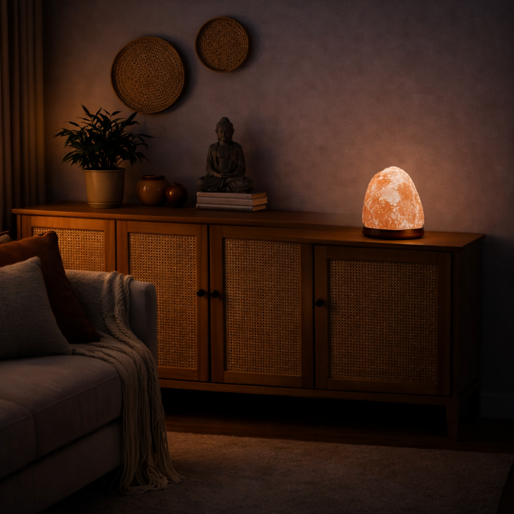 Himalaya-Salzlampen werden traditionell in bewusst gestalteten Interieurs eingesetzt und sollen eine ruhige und ausgeglichene Atmosphäre schaffen , insbesondere in Räumen, die von moderner Elektronik beeinflusst sind. Im eingeschalteten Zustand verströmen sie ein sanftes, warmes Bernsteinlicht, das Entspannung und beschauliche Abendrituale fördert.