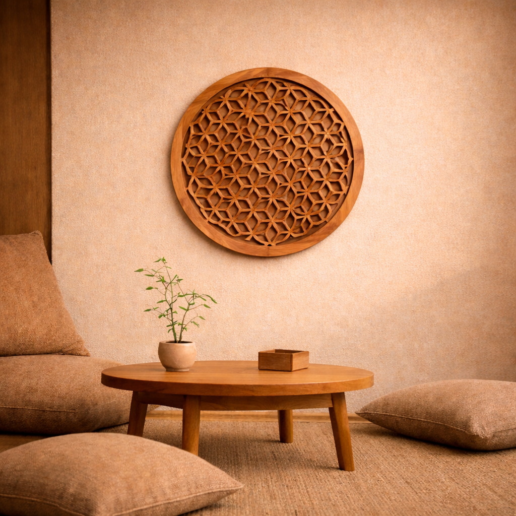 Dieses handgefertigte dekorative Holzpaneel „Blume des Lebens“ (40 cm) ist ein beeindruckendes Wandbild, das von erfahrenen indonesischen Kunsthandwerkern aus 100 % nachhaltig gewonnenem Suarholz sorgfältig geschnitzt wurde. Jedes Paneel ist handgefertigt, wodurch natürliche Abweichungen in Maserung und Schnitzerei jedes Stück zu einem Unikat machen.