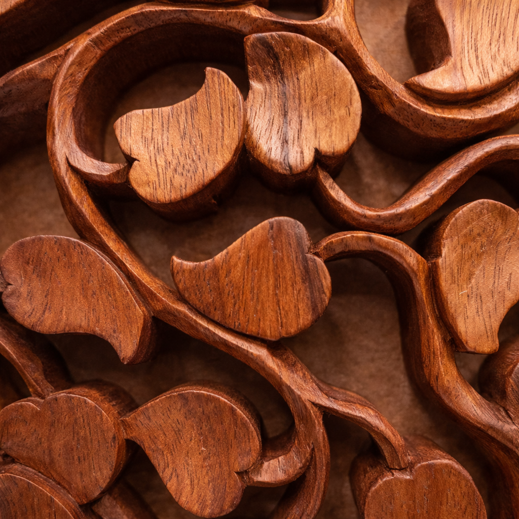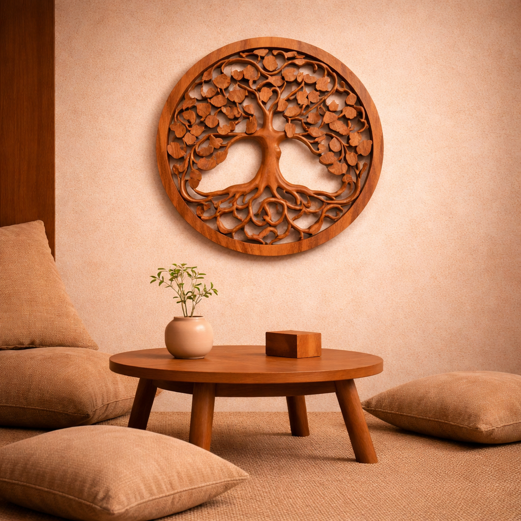 Dieses handgefertigte dekorative Holzpaneel „Baum des Lebens“ (40 cm Durchmesser) ist ein ausdrucksstarkes Wandbild, das von erfahrenen indonesischen Kunsthandwerkern sorgfältig aus 100 % nachhaltig gewonnenem Suarholz geschnitzt wurde. Jedes Paneel wird vollständig von Hand gefertigt, wodurch natürliche Abweichungen in Maserung und Schnitzerei jedes Stück zu einem Unikat machen.