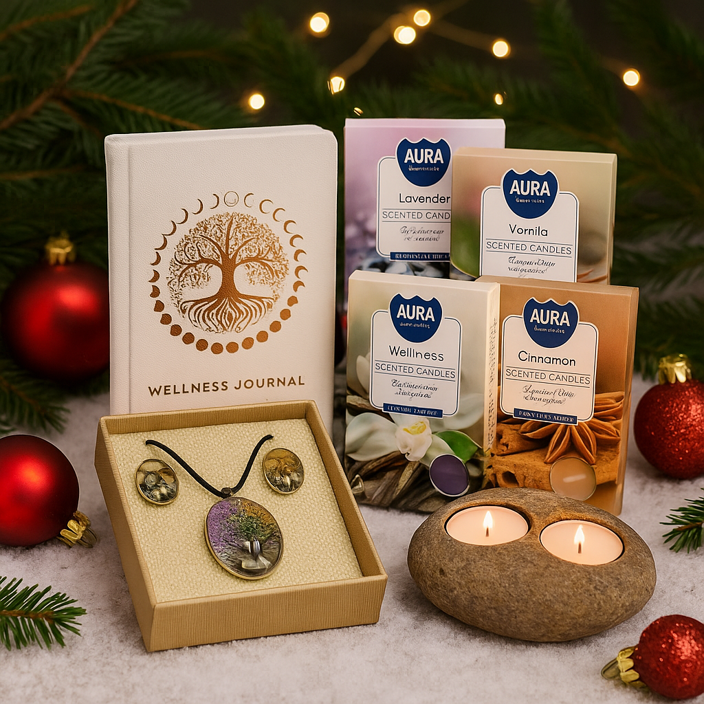 Enjoy the calming glow of scented candles, the grounding presence of natural stone, and the poetic touch of pressed-flower jewelry. Capture your thoughts in the elegant wellness journal and let serenity fill your home.