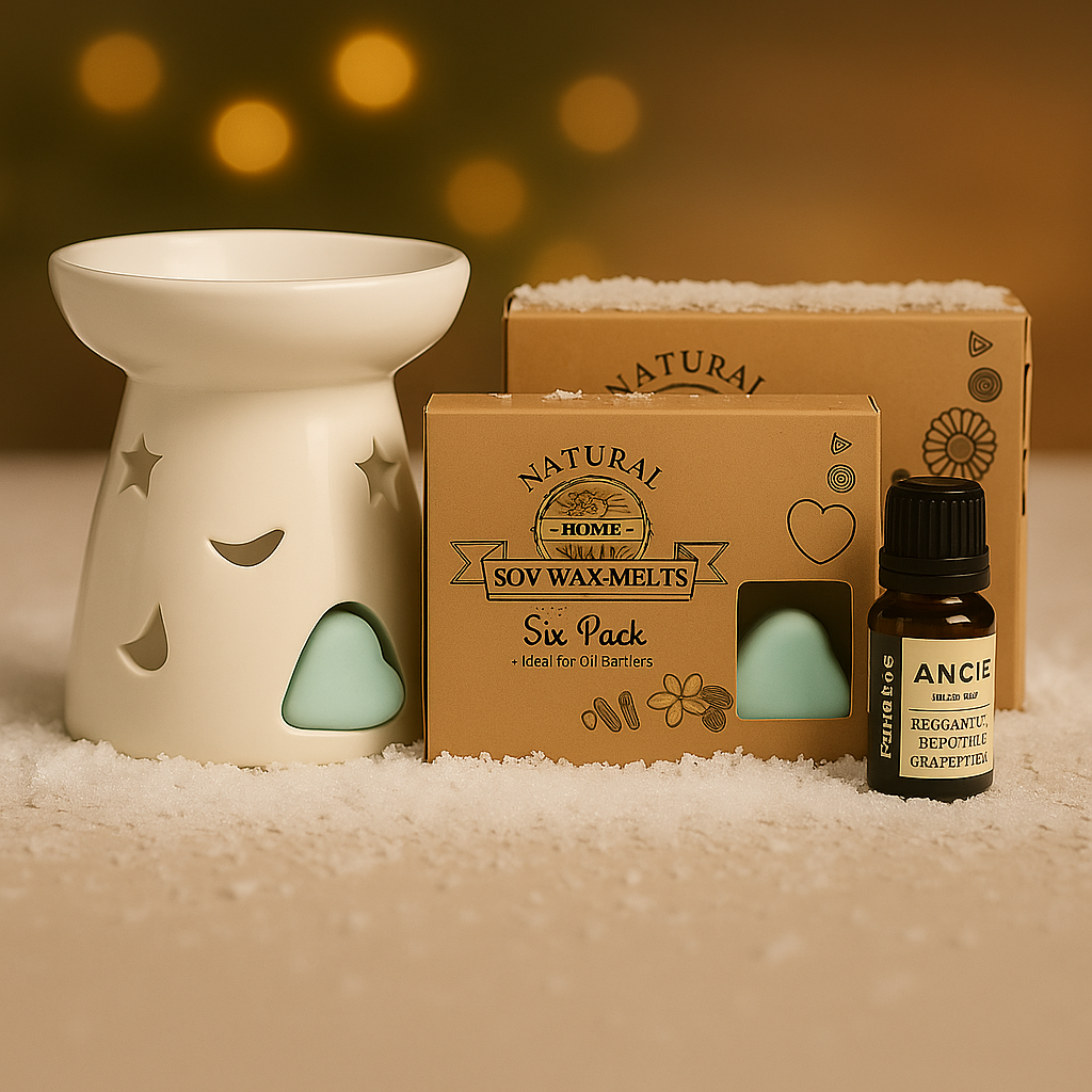This set features a white ceramic burner with star cutouts, natural soy wax melts, and a Happiness essential oil blend with Bergamot, Ylang Ylang, and Grapefruit — creating an uplifting aroma that encourages relaxation and balance.
